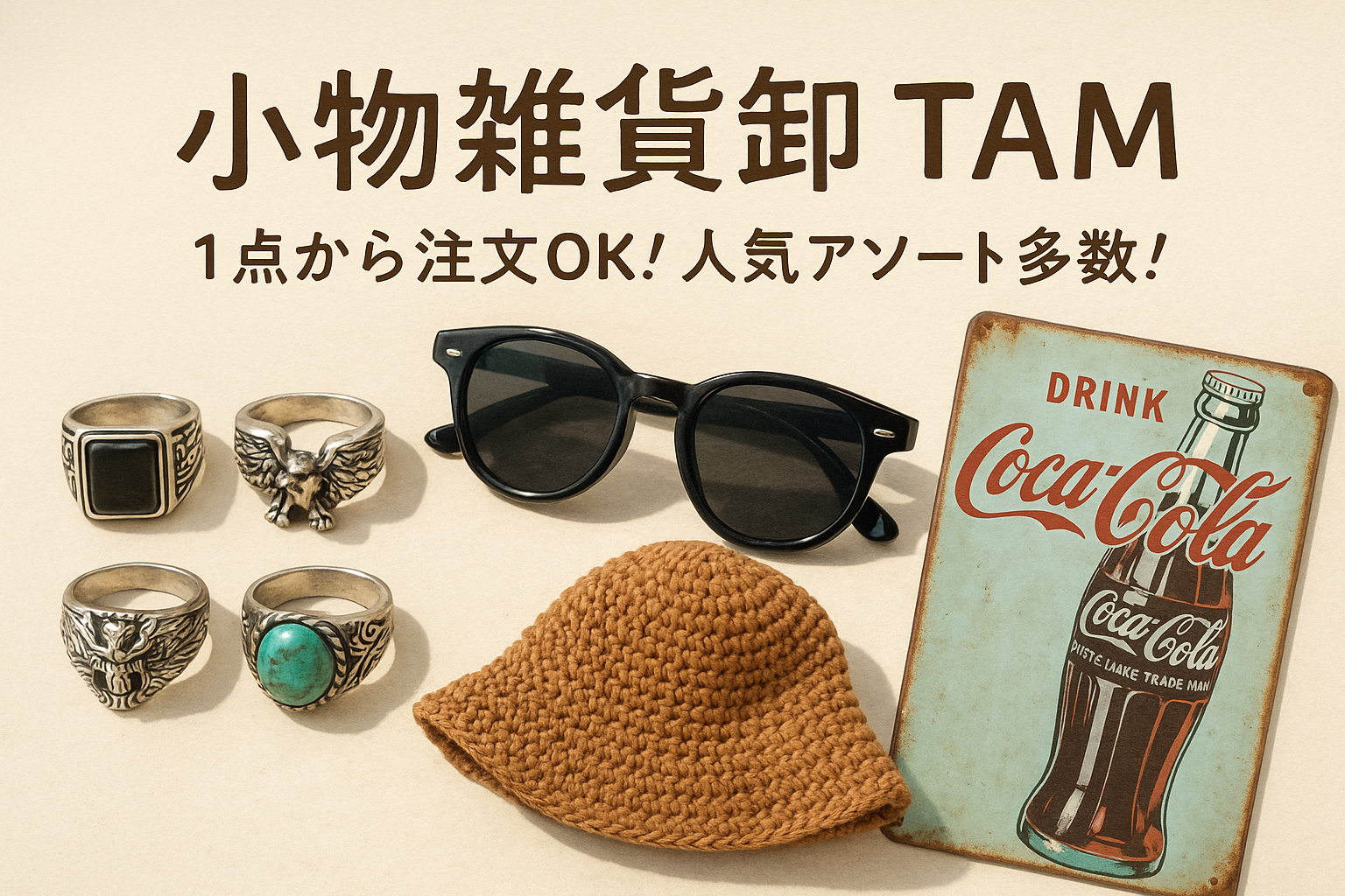 TAMはリング・アクセサリー・ブリキ看板など、1,000点以上のアイテムを扱う小物雑貨専門の卸業者です。